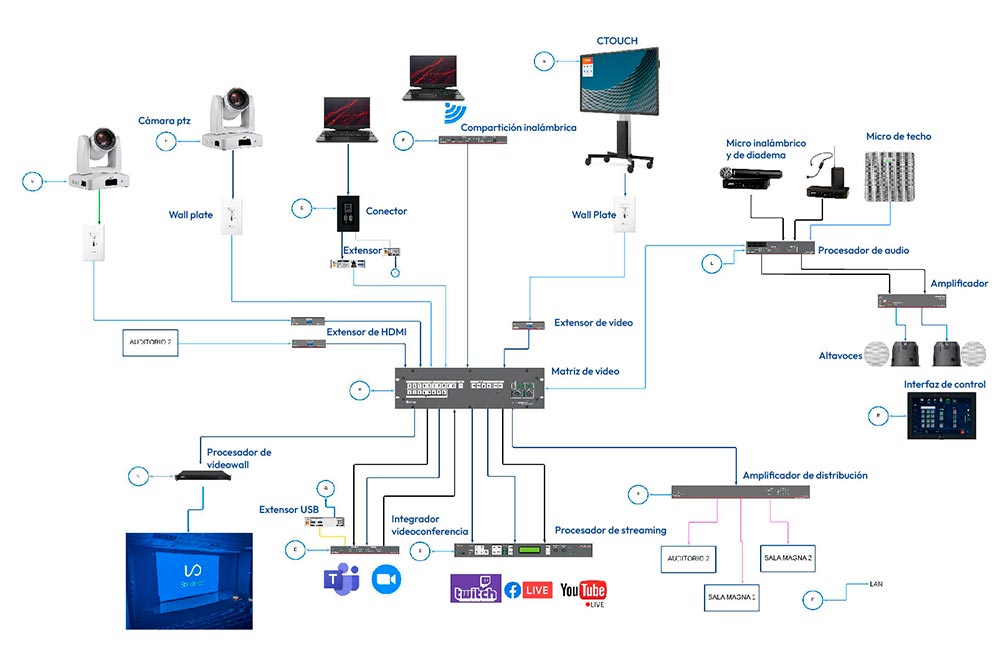 - Sistemas de audio y video para streaming: Micrófonos de conferencia, tecnología beamforming y procesadores de streaming.